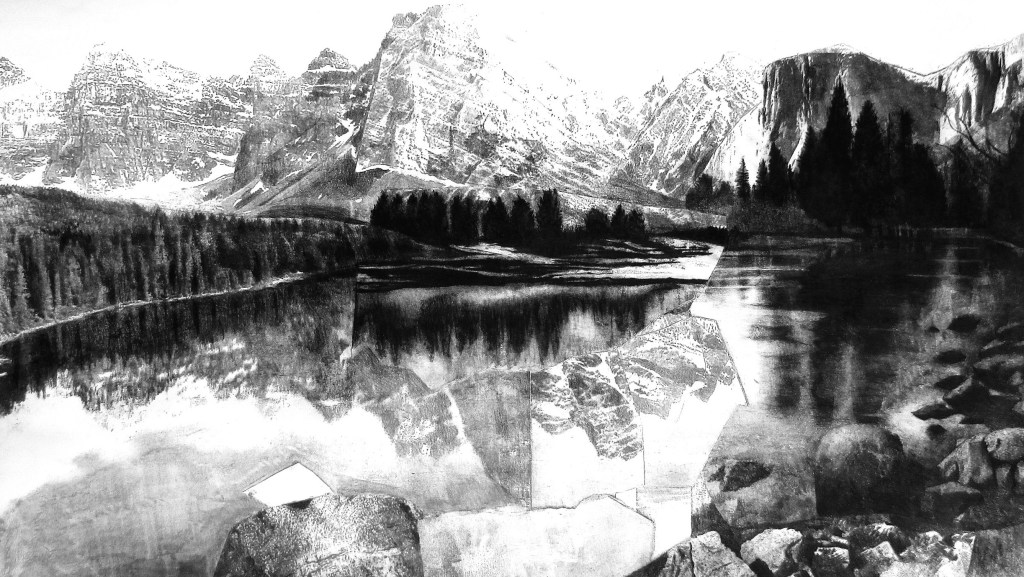 I am drawn to the sublime power of landscapes, from epic, snow laden mountainscapes to dense and all-encompassing forestlands, which are laced with equal amounts of breathtaking beauty and abject fear. Through collage I create dreamlike, imaginary landscapes which become the starting point for drawings and prints.